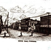 Photograph of Centre Street facing east before the fires of 1876 amd 1883. Pictured on the left are the Duyree building owned by William B. C. Duryee and Timanus Hall owned by Henry Timanus.