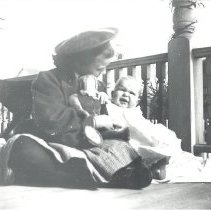 Marian Davis, sitting on floor of porch of Davis home at 421 N. 3rd. St., holds a doll and her first cousin George T. Davis. Black dog and houses in background. One 4 x 5" print and one 8 x 10" englargement.